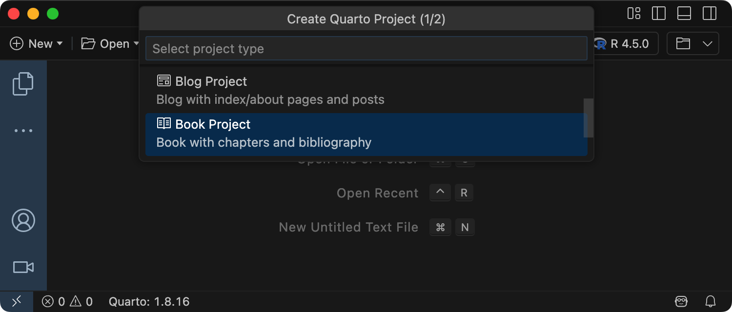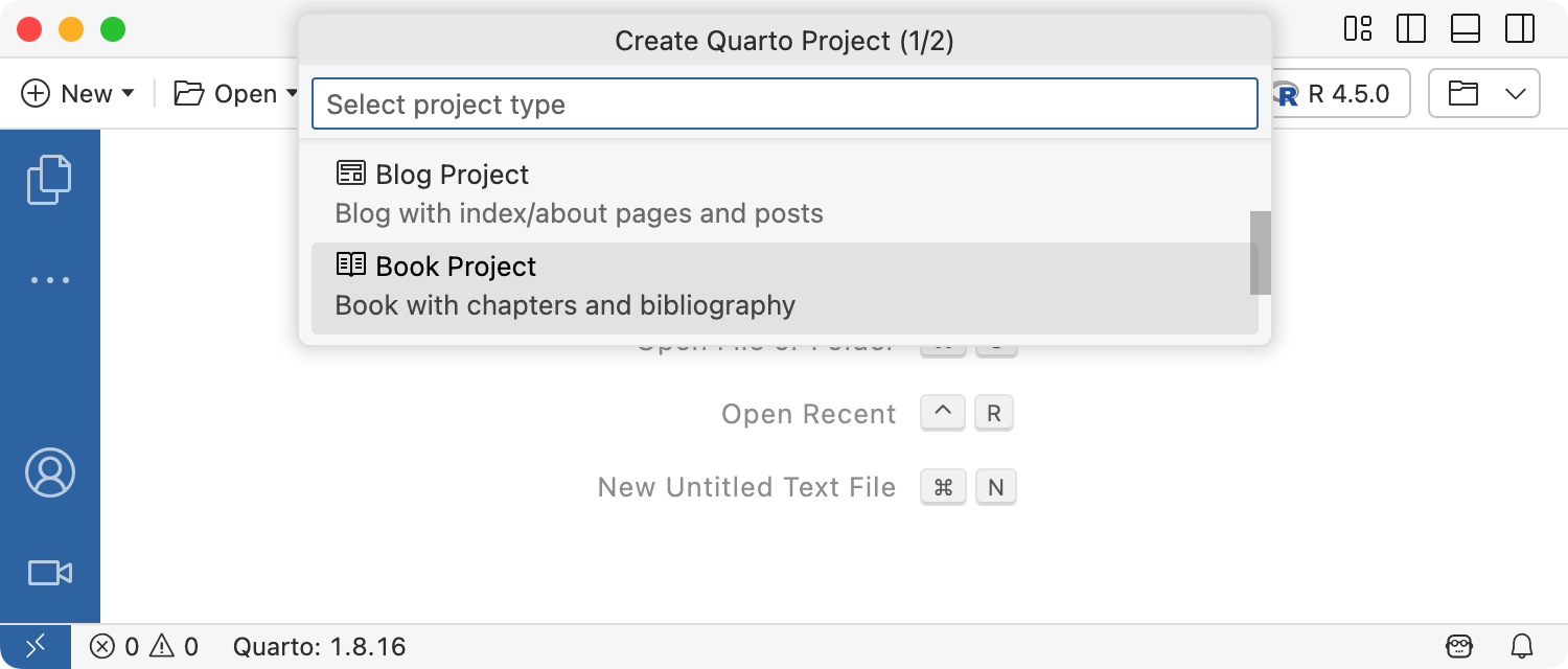 To create a new book project within RStudio, use the New Project command and select Quarto Book: