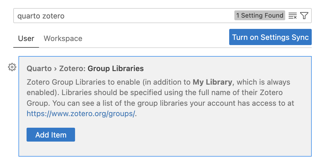 Zotero Groups provide a powerful way to share collections with a class or work closely with colleagues on a project. By default, Zotero Group Libraries are not included in the Insert Citation dialog or citation completions. However, you can use the Quarto > Zotero: Group Libraries option to activate one or more group libraries (either globally, or per-workspace):